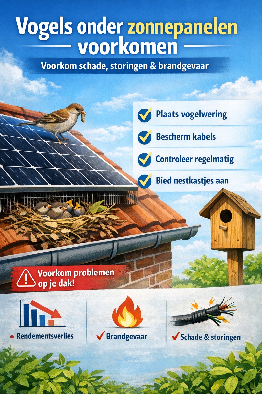 Vogels onder zonnepanelen komen vaker voor dan je denkt. Hoewel het onschuldig lijkt, kunnen vogelnesten leiden tot rendementsverlies, storingen en zelfs brandgevaar. Gelukkig kun je dit eenvoudig voorkomen met de juiste maatregelen. In dit artikel lees je alles over de risico’s én hoe je jouw zonnepanelen beschermt tegen vogels. Waarom